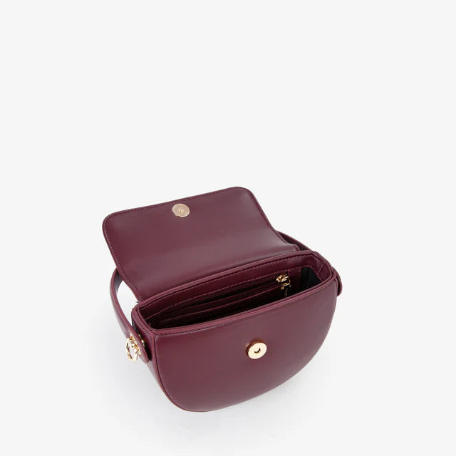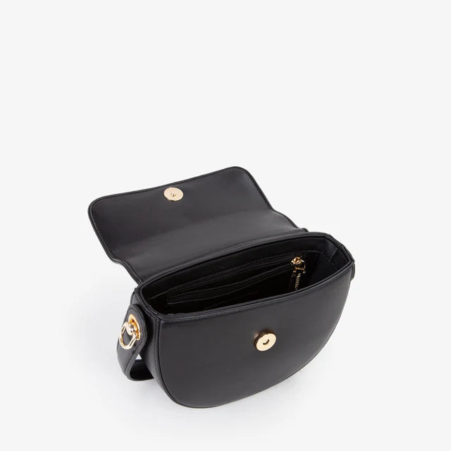 Pattina, dalle piccole dimensioni, con logo in lettere metalliche di colore oro, all' interno di una cornice dello stesso colore della borsa