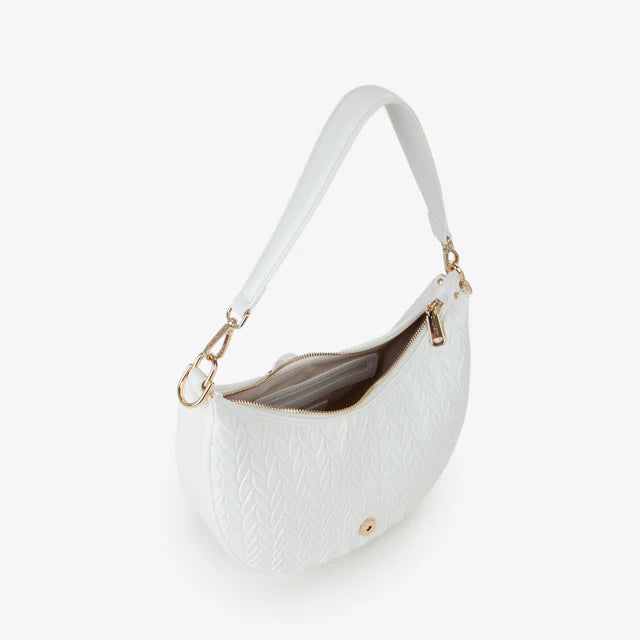 Sacca dalla finitura goffrata, con logo di metallo, dorato, che si poggia sul davanti in verticale.
