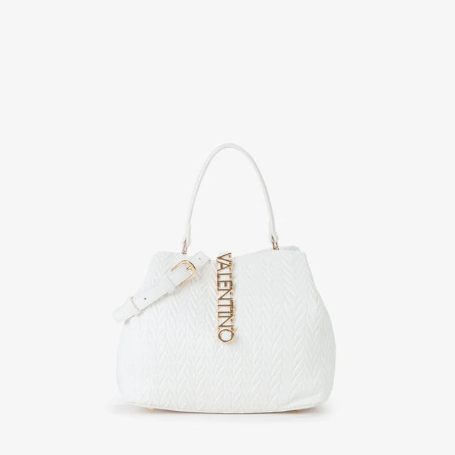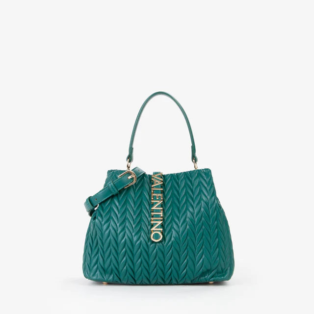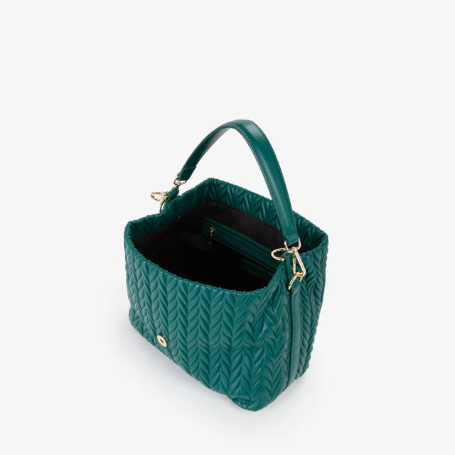 Secchiello dalla finitura goffrata, con logo di metallo, dorato, che si poggia sul davanti in verticale.