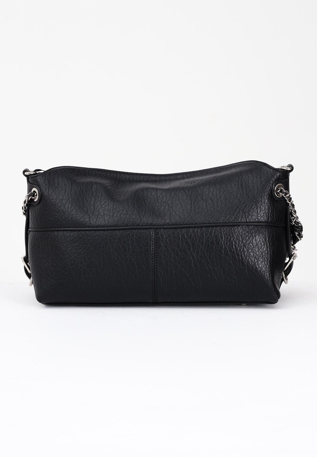 RICHMOND Shopper nera da donna caratterizzata da un design morbido e contemporaneo. Presenta una pratica chiusura con zip superiore e catena intrecciata in pelle e metallo che funge da manico, aggiungendo un dettaglio grintoso. L'interno, foderato con logo, è spazioso e dotato di tasca con zip per organizzare al meglio gli oggetti personali. Sul frontale è presente il logo metallico John Richmond. Una borsa versatile, perfetta sia per l'uso quotidiano che per look più sofisticati. Dimensioni: A 19cm; L 32cm, P 12cm. Stagione autunno inverno