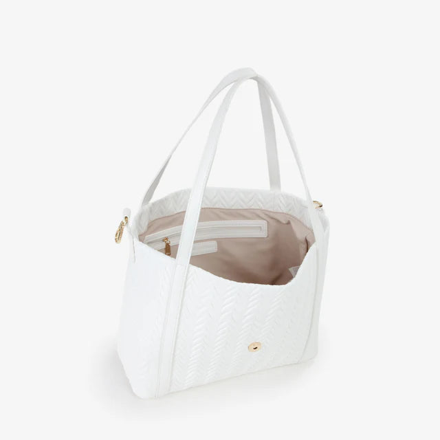 Shopping a spalla, dalla finitura goffrata, con logo di metallo, dorato, che si poggia sul davanti in verticale.